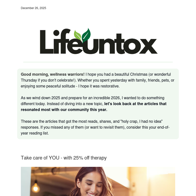 | Good morning, wellness warriors! I hope you had a beautiful Christmas (or wonderful Thursday if you don't celebrate!). Whether you spent yesterday with family, friends, pets, or enjoying some peaceful solitude - I hope it was restorative. | As we wind down 2025 and prepare for an incredible 2026, I wanted to do something different today. Instead of diving into a new topic, let's look back at the articles that resonated most with our community this year. | These are the articles that got the most reads, shares, and "holy crap, I had no idea" responses. If you missed any of them (or want to revisit them), consider this your end-of-year reading list. |