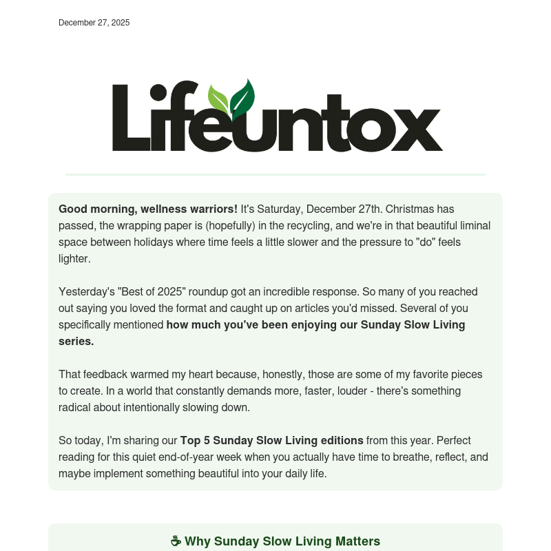 | Good morning, wellness warriors!Β It's Saturday, December 27th. Christmas has passed, the wrapping paper is (hopefully) in the recycling, and we're in that beautiful liminal space between holidays where time feels a little slower and the pressure to "do" feels lighter. | Yesterday's "Best of 2025" roundup got an incredible response. So many of you reached out saying you loved the format and caught up on articles you'd missed. Several of you specifically mentioned how much you've been enjoying our Sunday Slow Living series. | That feedback warmed my heart because, honestly, those are some of my favorite pieces to create. In a world that constantly demands more, faster, louder - there's something radical about intentionally slowing down. | So today, I'm sharing our Top 5 Sunday Slow Living editions from this year. Perfect reading for this quiet end-of-year week when you actually have time to breathe, reflect, and maybe implement something beautiful into your daily life. |