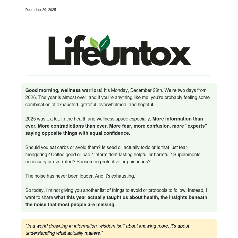 Good morning, wellness warriors!Β It's Monday, December 29th. We're two days from 2026. The year is almost over, and if you're anything like me, you're probably feeling some combination of exhausted, grateful, overwhelmed, and hopeful. | 2025 was... a lot. In the health and wellness space especially. More information than ever. More contradictions than ever. More fear, more confusion, more "experts" saying opposite things with equal confidence. | Should you eat carbs or avoid them? Is seed oil actually toxic or is that just fear-mongering? Coffee good or bad? Intermittent fasting helpful or harmful? Supplements necessary or overrated? Sunscreen protective or poisonous? | The noise has never been louder. And it's exhausting. | So today, I'm not giving you another list of things to avoid or protocols to follow. Instead, I want to share what this year actually taught us about health, the insights beneath the noise that most people are missing. |