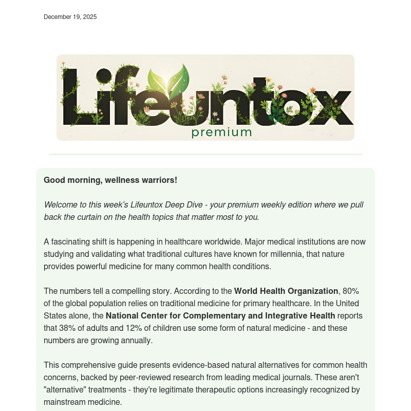 | Good morning, wellness warriors! | Welcome to this week's Lifeuntox Deep Dive - your premium weekly edition where we pull back the curtain on the health topics that matter most to you. | A fascinating shift is happening in healthcare worldwide. Major medical institutions are now studying and validating what traditional cultures have known for millennia, that nature provides powerful medicine for many common health conditions. | The numbers tell a compelling story. According to the World Health Organization, 80% of the global population relies on traditional medicine for primary healthcare. In the United States alone, the National Center for Complementary and Integrative Health reports that 38% of adults and 12% of children use some form of natural medicine - and these numbers are growing annually. | This comprehensive guide presents evidence-based natural alternatives for common health concerns, backed by peer-reviewed research from leading medical journals. These aren't "alternative" treatments - they're legitimate therapeutic options increasingly recognized by mainstream medicine. | The goal isn't to replace necessary medical care but to provide a fuller spectrum of options. Modern medicine excels at acute care, diagnostics, and life-saving interventions. Natural medicine often shines for prevention, chronic conditions, and supporting the body's inherent healing processes. Together, they offer the most complete approach to health. | Share the wellness wisdom: Forward to someone you care about (copy URL here).